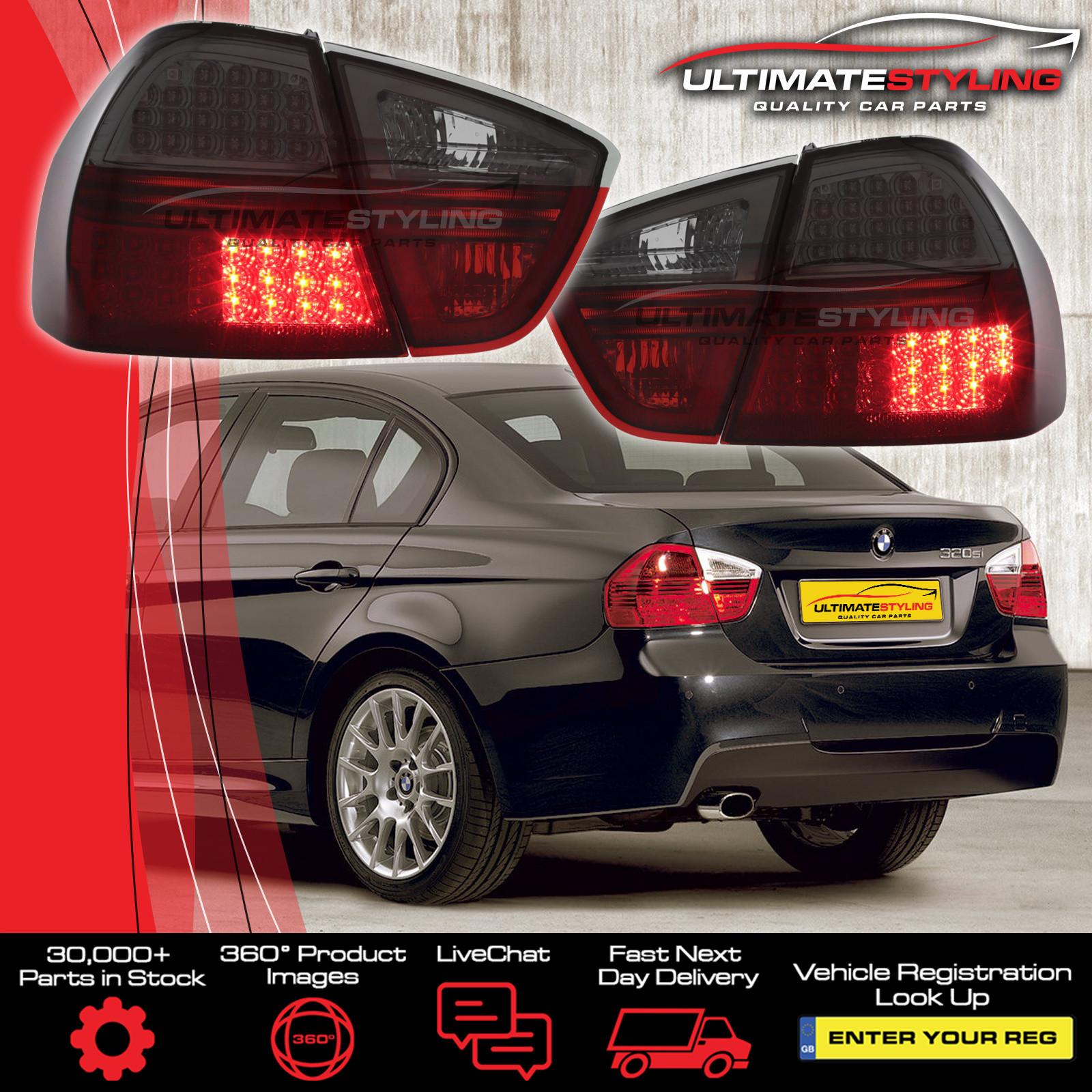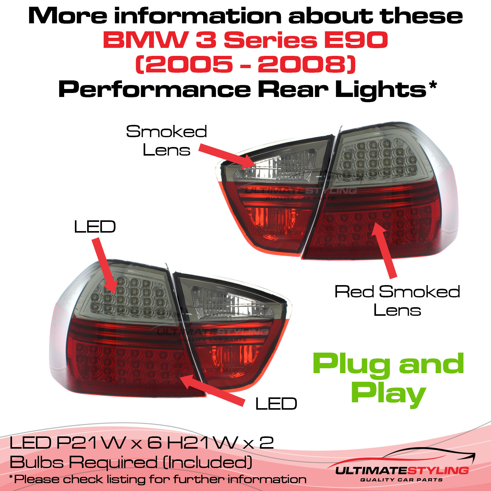 • BMW 3 Series E90 Saloon 2005-2008 Upgrade LED Red Smoked Rear Tail Lights Pair